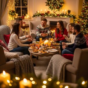 Keep the lighting warm with candles and fairy lights to create a cozy, welcoming environment that feels both festive and intimate.