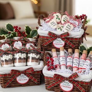 Ideas include mini jars of hot cocoa mix, peppermint bath salts, or personalized ornaments with the baby’s name and shower date.