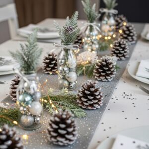 Transform your space into a winter dream with white tablecloths, frosted pinecones, glittery snowflakes, and soft lighting.