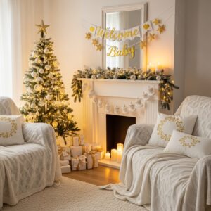 Add baby-inspired accents — like pacifier ornaments, tiny stockings, or baby bootie garlands — to tie in the shower theme with Christmas warmth.