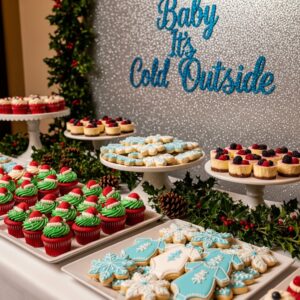 A dessert table doubles as decor! Include cupcakes topped with snowflakes, sugar cookies shaped like onesies or Christmas trees, and mini cheesecakes with red and green sprinkles.