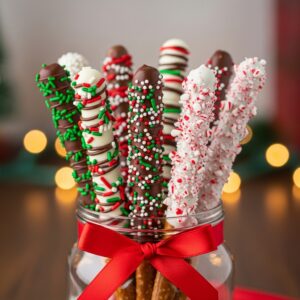Salty, sweet, and festive, these pretzels are dipped in melted chocolate and sprinkled with red and green sprinkles.