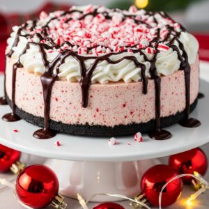 Cool, creamy, and festive, this no-bake cheesecake features a chocolate cookie crust and a peppermint-infused filling.