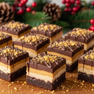 The base layer is a mix of peanut butter, graham crumbs, and powdered sugar, topped with a smooth layer of chocolate.