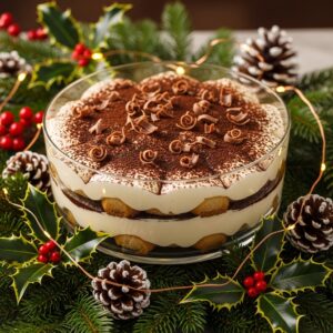 This elegant dessert layers coffee-soaked ladyfingers, mascarpone cream, and cocoa powder in a trifle bowl.