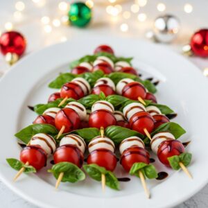 For a fresh and colorful bite, try Caprese Christmas skewers. Skewer cherry tomatoes, mozzarella balls, and basil leaves, then drizzle with balsamic glaze.