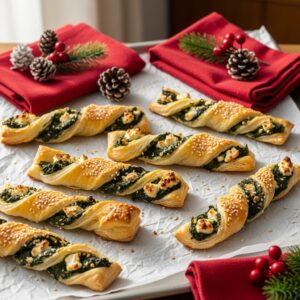 Crispy, cheesy, and full of flavor, these spinach and feta twists are a great finger food for Christmas parties.