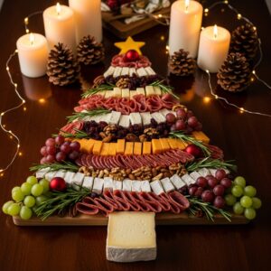 Arrange slices of cheese, cured meats, grapes, and nuts in the shape of a Christmas tree on a large board.