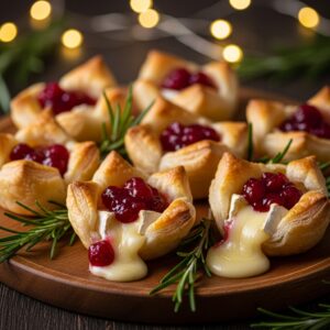 Puff pastry cups filled with creamy brie cheese and a dollop of tart cranberry sauce are baked until golden.