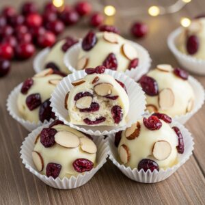 Melt white chocolate and mix in dried cranberries, almonds, and a handful of crunchy cereal.
