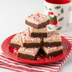 Peppermint fudge layers rich chocolate with a swirl of white chocolate and crushed peppermint candies.
