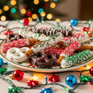 For a fun and festive treat, dip pretzels in melted chocolate and decorate them with holiday sprinkles.