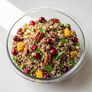 Fluffy quinoa tossed with dried cranberries, toasted pecans, parsley, and a simple citrus vinaigrette.