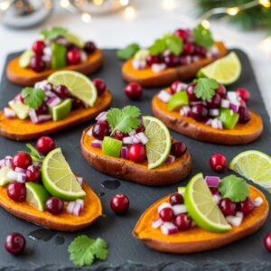 Roasted sweet potato slices topped with a bright cranberry-lime salsa.