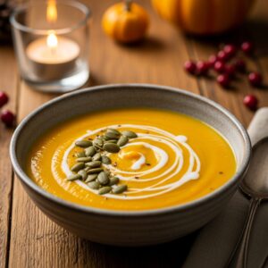 A smooth, warming soup made from roasted butternut squash blended with ginger, garlic, and vegetable broth.