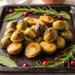 Halved Brussels sprouts are roasted with a mix of maple syrup, Dijon mustard, and olive oil.