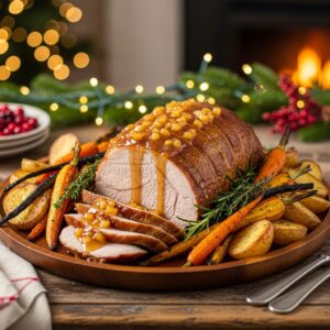 A roasted pork loin marinated in apple cider, mustard, and garlic brings hearty protein to the table with a festive twist.