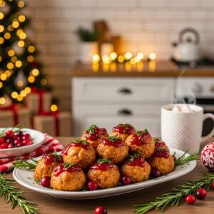 These festive meatballs combine ground chicken with oats, herbs, and dried cranberries.