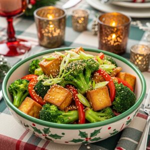 Crispy tofu cubes tossed with broccoli, bell peppers, soy sauce, ginger, and garlic deliver a balance of flavor and protein.