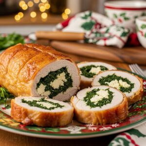 Baking the rolled chicken creates a juicy interior with a tangy, savory filling.
