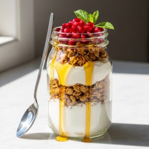 Layer creamy Greek yogurt with pomegranate seeds, granola, and a drizzle of honey.
