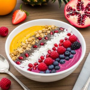 Top with pomegranate arils, coconut flakes, chia seeds, and granola for a vibrant, nutrient-packed breakfast bowl.