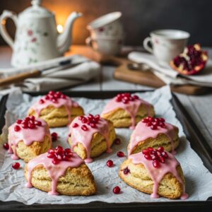 Delicate, buttery scones dotted with pomegranate seeds and finished with a light pomegranate glaze.
