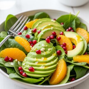 A light and colorful breakfast salad made with baby spinach, oranges, avocado, and pomegranate seeds, tossed in a citrus dressing.