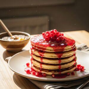 Fluffy golden pancakes topped with pomegranate syrup and a handful of fresh seeds.