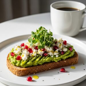 Spread mashed avocado on whole-grain toast and top with pomegranate seeds, feta cheese, and a drizzle of olive oil.