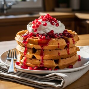 Crispy waffles drizzled with pomegranate glaze and sprinkled with fresh seeds.