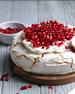 A crisp meringue shell filled with whipped cream and topped with pomegranate arils is a dessert that looks straight out of a bakery window.