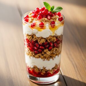 Layer Greek yogurt or whipped cream with granola, pomegranate seeds, and a drizzle of honey in a glass for a simple yet elegant dessert.