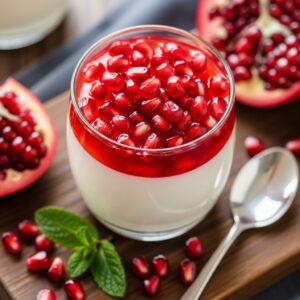 The combination of smooth, custard-like texture and tangy pomegranate flavor creates a refreshing, light dessert.