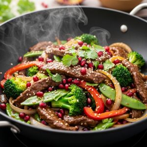 For a quick weeknight meal, stir-fry beef strips, bell peppers, and onions, then toss with a glaze made from pomegranate molasses, ginger, and soy sauce.
