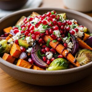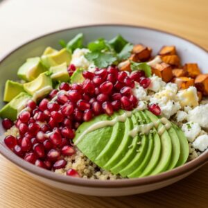 The roasted vegetables bring a natural sweetness that pairs perfectly with the tartness of pomegranate, making this bowl both hearty and healthy.