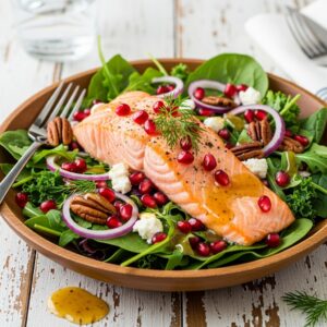 The pomegranate adds a refreshing brightness that cuts through the richness of the salmon, creating a balanced, nourishing dish.