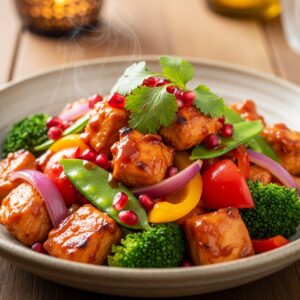 Add a fruity twist to your dinner by tossing grilled chicken, broccoli, and bell peppers in a pomegranate glaze made from pomegranate juice, garlic, and soy sauce.