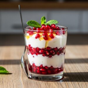 Start your morning right with a layered parfait made from Greek yogurt, fresh pomegranate seeds, granola, and a drizzle of honey.