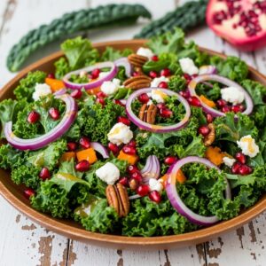 This nutrient-dense salad combines massaged kale, pomegranate arils, avocado, and toasted almonds with a simple apple cider vinaigrette.