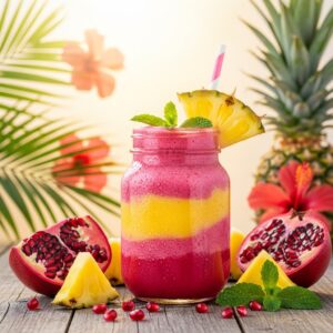 A refreshing tropical twist! Blend pomegranate juice, pineapple, Greek yogurt, and a few mint leaves.