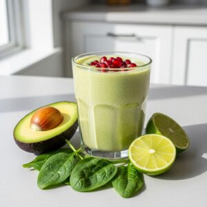 This creamy, nutrient-rich smoothie combines pomegranate juice, avocado, spinach, and lime juice.