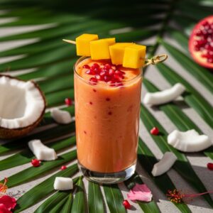 Tropical meets tangy in this vibrant drink. Combine pomegranate seeds, mango chunks, orange juice, and coconut milk.
