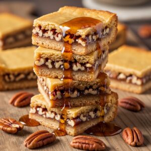 They feature a buttery shortbread crust topped with a maple syrup filling and toasted pecans.