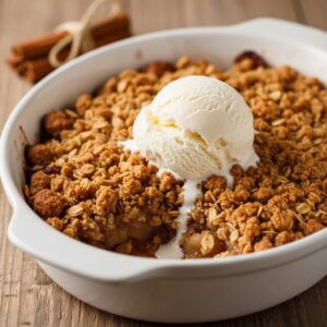 Made with sliced apples tossed in cinnamon sugar and topped with a crumbly oat mixture, it’s delicious on its own or served warm with ice cream melting on top.