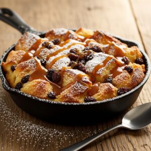 Soaked in a rich custard with raisins and baked until golden, bread pudding becomes heavenly when served warm with a drizzle of bourbon or vanilla sauce.