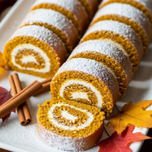 Soft pumpkin sponge cake is rolled with a sweet cream cheese filling, creating elegant spirals.