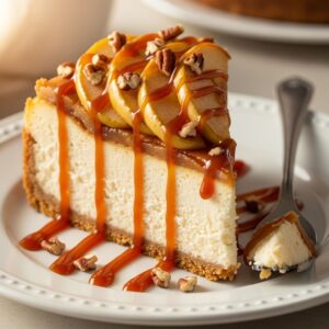 A creamy cheesecake base topped with spiced apples and drizzled caramel sauce makes it an impressive and flavorful choice that travels well, too.