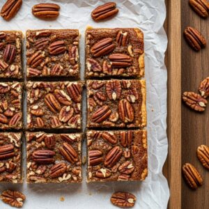 A portable twist on classic pecan pie! These bars have a shortbread crust and a sweet, nutty topping.