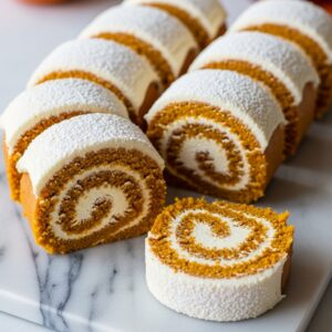 This dessert is a showstopper! A soft pumpkin sponge cake rolled with cream cheese filling looks elegant and tastes amazing.